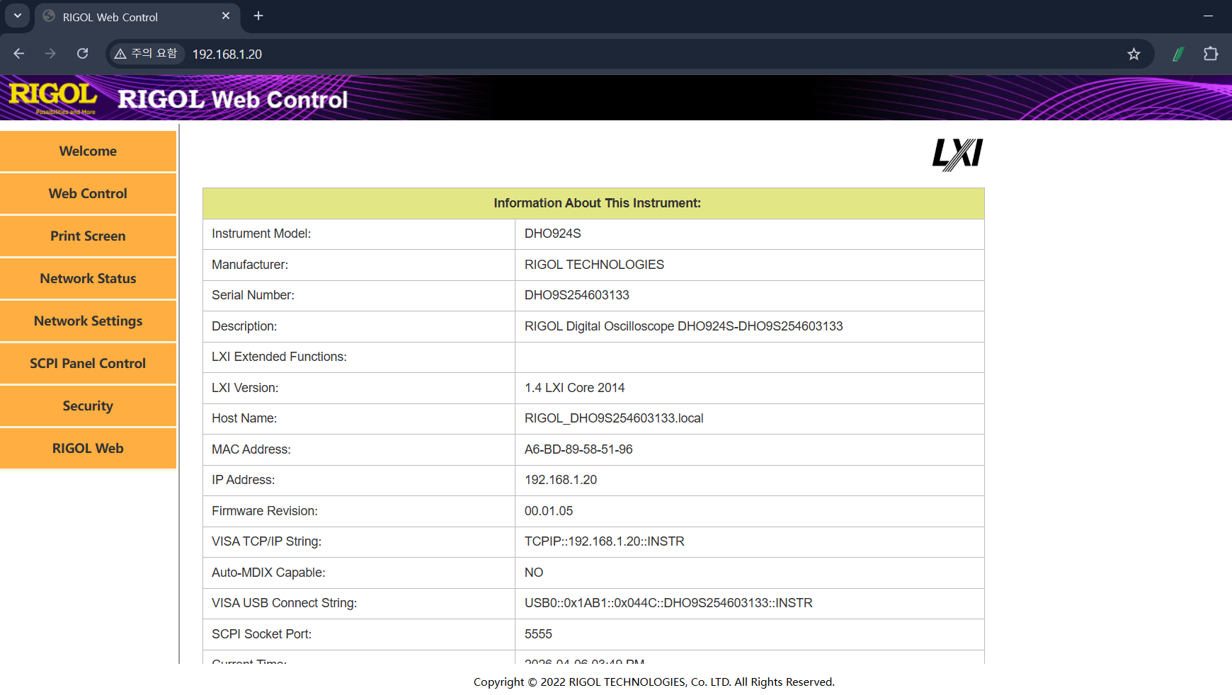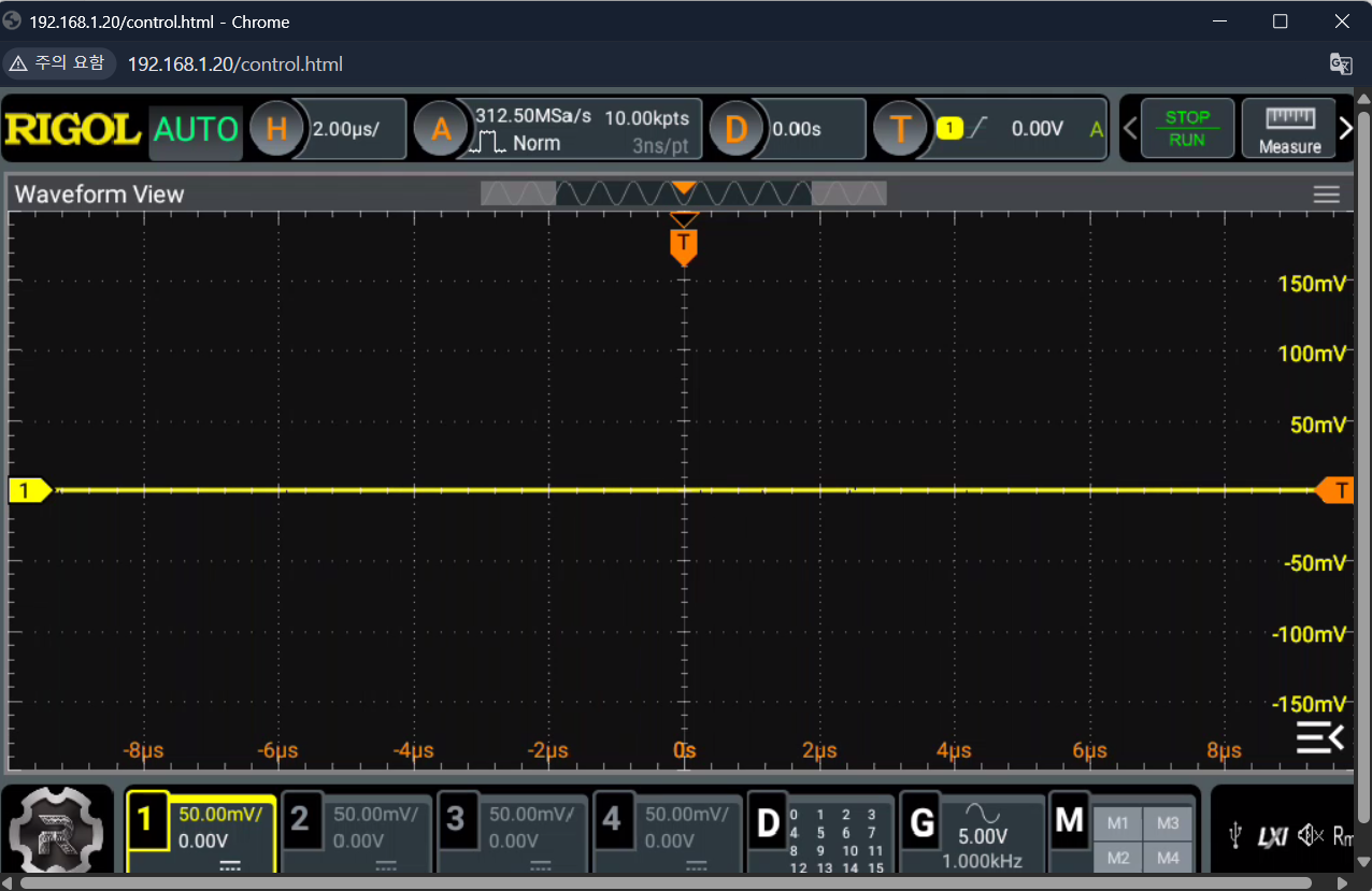http://192.168.1.20).Web Control 실행: 접속 후 나타나는 웹 페이지에서 아래 이미지와 같이 Web Control 메뉴를 클릭합니다. 이제 브라우저 화면에 오실로스코프의 인터페이스가 표시되며, 마우스로 실제 장비처럼 조작할 수 있습니다.