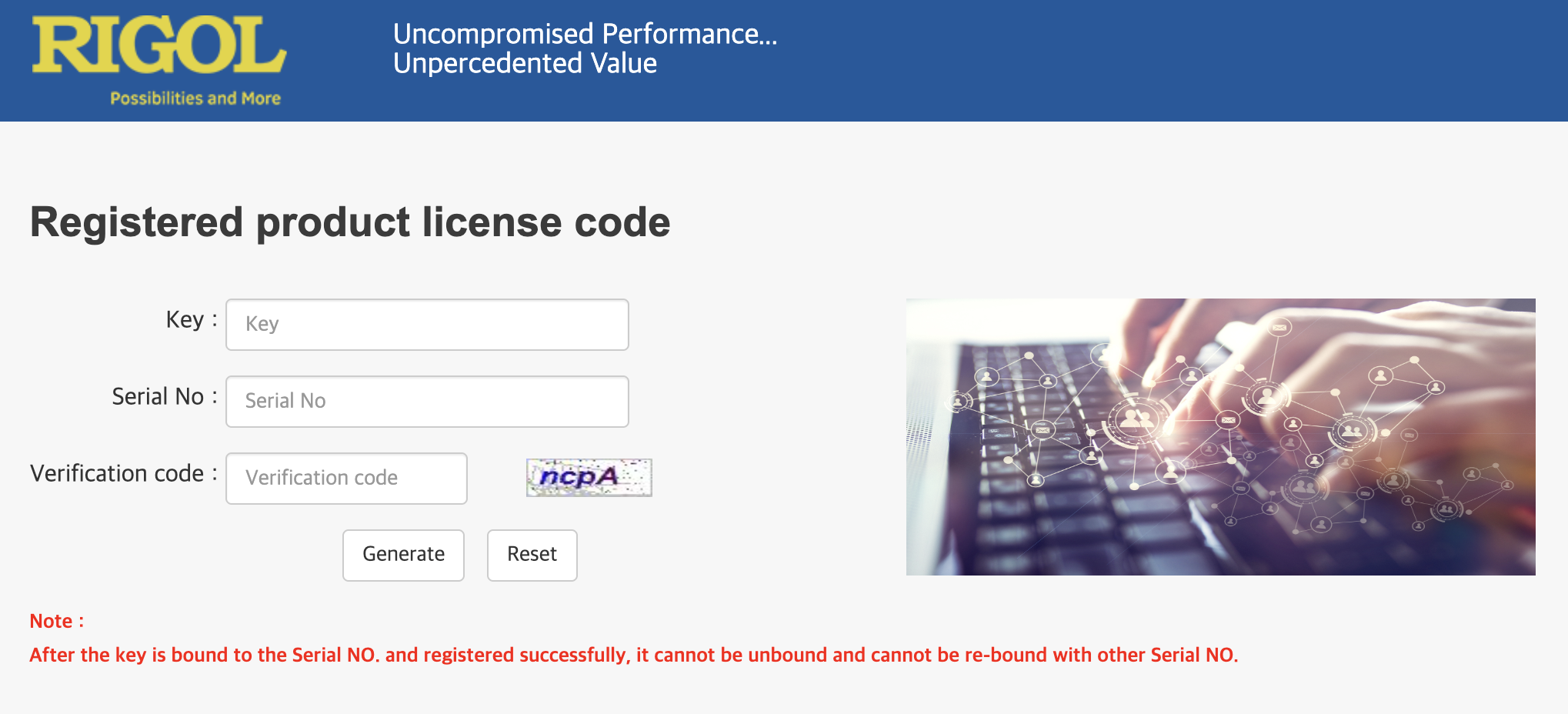 라이선스 사이트 접속: PC에서 RIGOL 라이선스 활성화 페이지(https://licenseen.rigol.com/CustomerService/ProductRight_EN)에 접속합니다.